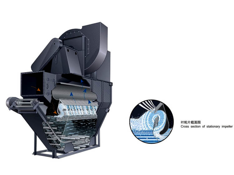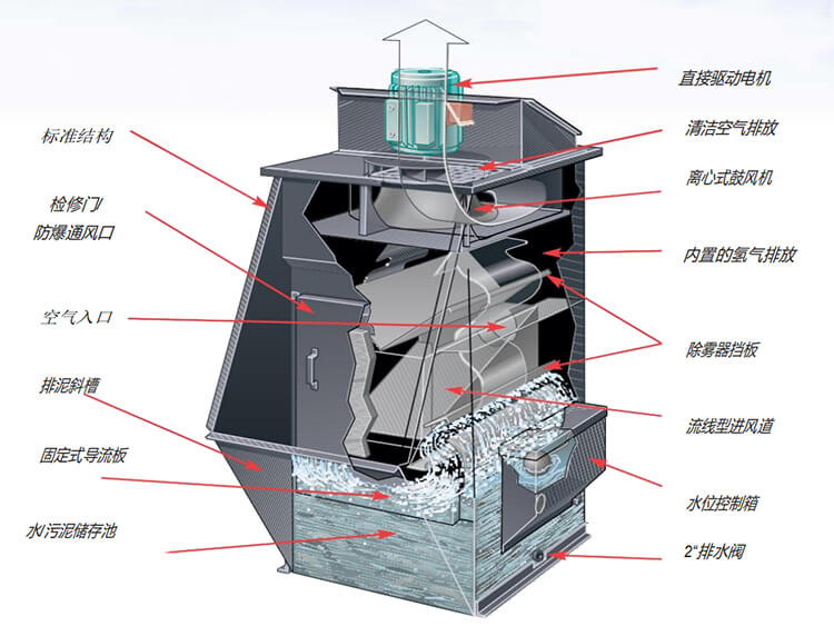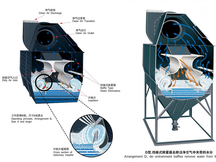在風機風動力的作用下,高速氣流在狹窄通道內呈S形軌跡運動的沖激力,強化粉塵在水洗作用下的濕潤、凝并和沉降功能。含塵氣體由入口進入除塵器,氣流轉彎向向沖擊水面,部分較大的塵粒落入水中。當含塵氣體以18-35米/秒的速度通過上、下葉片間的“S”形通道時,激起大量的水花,使水氣充分接觸,絕大部分微細的塵粒混入水中,使含塵氣體得以充分凈化,經由“S”形通道后,由于離心力的作用,獲得塵粒的水又返回漏斗。凈化后的氣體由分霧室擋水板除掉水滴后經凈氣出口和通風機排出除塵機組,泥漿則由漏斗的排漿閥連續或定期的排出。新水則有供水管路補充。機組內的水位由溢流箱控制。當水位高出溢流箱的溢流堰時,水便流進水封并由溢流管排出。設在溢流箱蓋上的水位自動控制裝置能保證水面在3-10毫米的范圍內變動,從而保證機組穩定的高效率和節約用水。溢流箱上部用通氣管與凈氣分霧室連通,使兩者具有相同高度的水面。溢流箱的水是通過插入除塵器下部的連通管連通的,以保持溢流箱水面平穩。