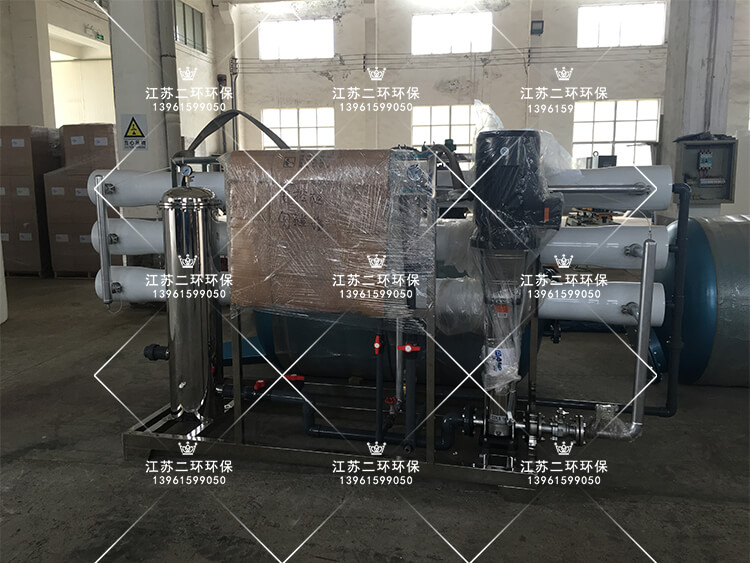 清水池→引水器→中水泵→機械過濾器(絮凝劑加藥)→活性炭過濾器(阻垢劑加藥)→增壓泵→布袋過濾器→超濾裝置→超濾水箱→超濾水箱→超濾水泵→保安過濾器→還原阻垢加藥系統→反滲透裝置→淡水箱、濃水箱(濃水處理系統)