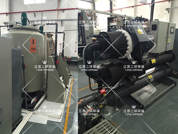 利用風冷式冷凍機或螺桿水冷機冷凍制冷,冷凍機自身帶有高效熱交換器,冷凍壓縮機制冷傳導給冷凍劑R22(乙二醇),溫度保持在-10攝氏度以上,形成冷凍水,存儲在冷凍水箱中。冷凍水與常溫稀硫酸,通過耐腐石墨管熱交換器進行熱量交換,石墨管內壁走流動的稀硫酸,石墨管外壁走流動的冷凍水。兩種液體存在較大的溫差梯度,常溫稀硫酸的熱量快速被石墨管外壁的低溫冷凍水帶走,從而使得稀硫酸能夠快速的被冷卻。整個過程在密閉的容器中進行,沒有酸霧飄逸,安全可靠。